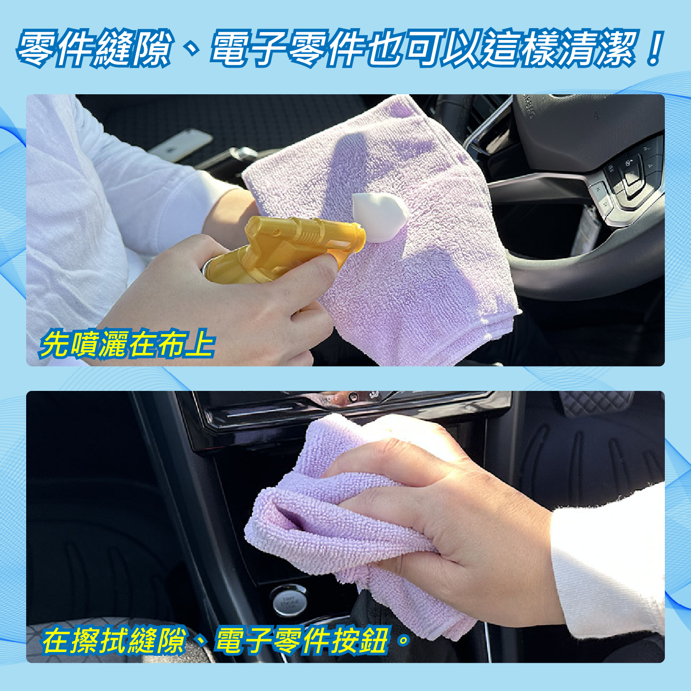 | ※使用前,請搖勻罐身。※因產品特性,噴灑後,如噴嘴上殘留液體,請擦乾。 [內窗、儀表板、方向盤、安全帶、車門邊緣等部位清潔] 1.先噴在乾淨的乾毛巾上,擦拭需施工的部位。 2.用於電子設備或開關製品時,請先噴在毛巾上,滲透後再擦拭使用。 ※請勿直接噴灑於電子設備或開關上。 [座椅清潔] 1.請在座椅背面及坐墊處,噴灑約3秒再使用乾淨的乾毛巾擦拭。若髒汙嚴重時,請用擰乾的溼毛巾擦拭,並充分乾燥。如髒汙仍未清除,請重複上述步驟。 ※其他部位則少於1秒的噴灑量為準,先噴在布上後,再清潔乾淨。 2.使用於清潔兒童安全座椅,務必要再用清水擦拭,以確保安全。 [車頂、腳踏墊清潔] 1.用於腳踏墊時,請先清除表面的砂石等雜物。 2.將清潔劑噴在擰乾的溼毛巾上擦拭,並充分乾燥。 ※一瓶約可用於2台中型車,若不包含車頂及腳踏墊清潔,可使用於3台中型車。 |