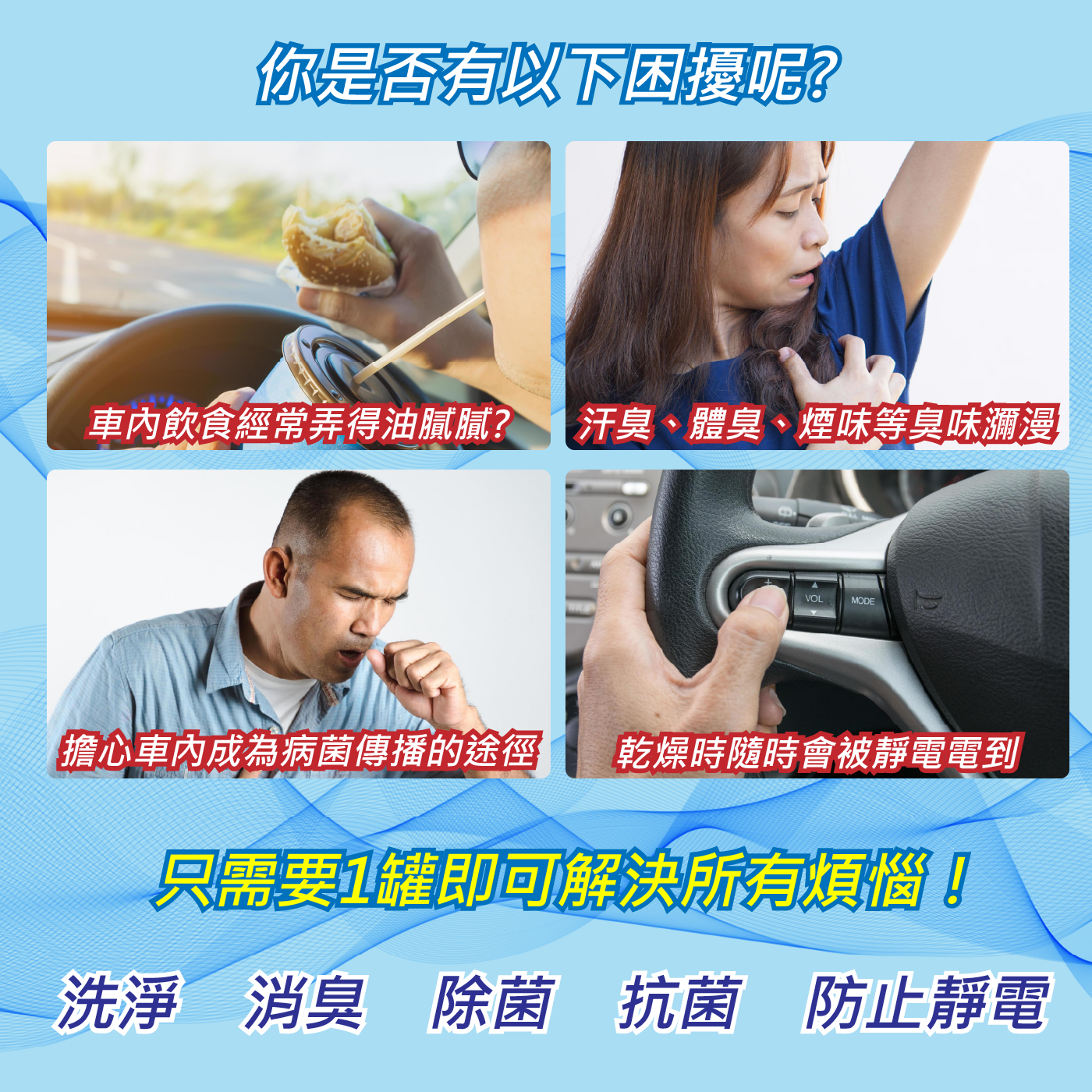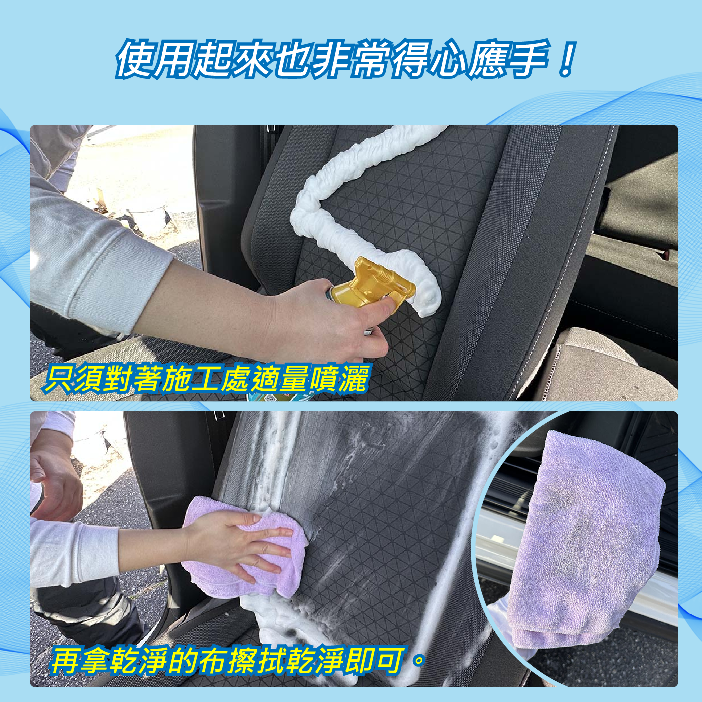 | 1.只需一瓶,即可徹底清潔無法用水清洗的車內裝製品,帶來如同水洗般清爽潔淨的效果。 2.全新開發「高密度綿密泡沫」,完全分解水性及油性汙垢,達到深層清潔效果。 3.不僅用於織布座椅,還可用於安全帶、方向盤、排擋桿、儀表板、車窗玻璃、車頂等車內裝製品。(真皮材質除外) 4.具備除臭、抗菌、除菌、去除病毒及防靜電等多重功效,無香味設計,打造清潔又舒適的車內空間。※並非所有細菌與病毒都有效。 |