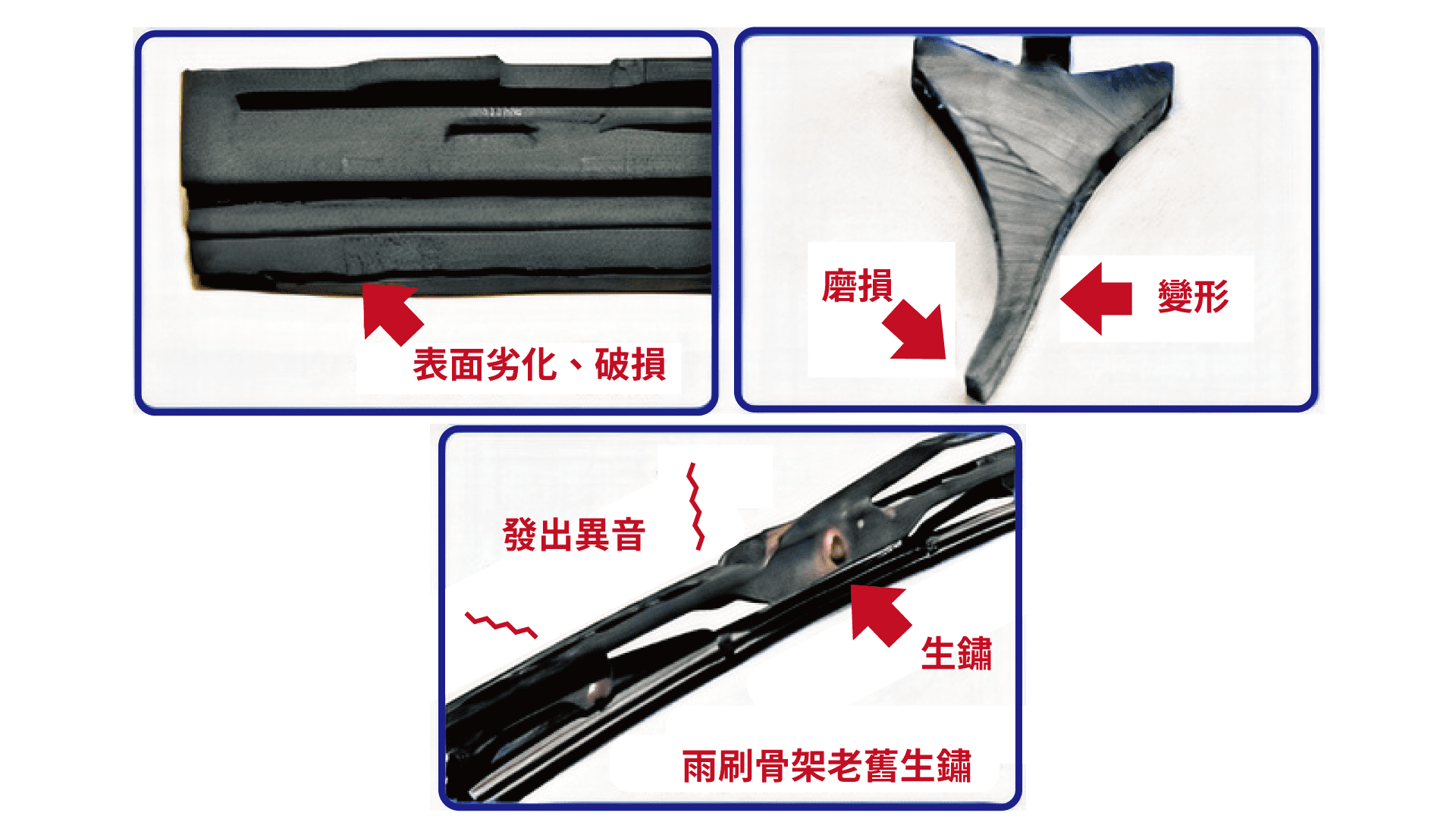 ▲ 雨刷骨架、雨刷膠條劣化的各種情況。