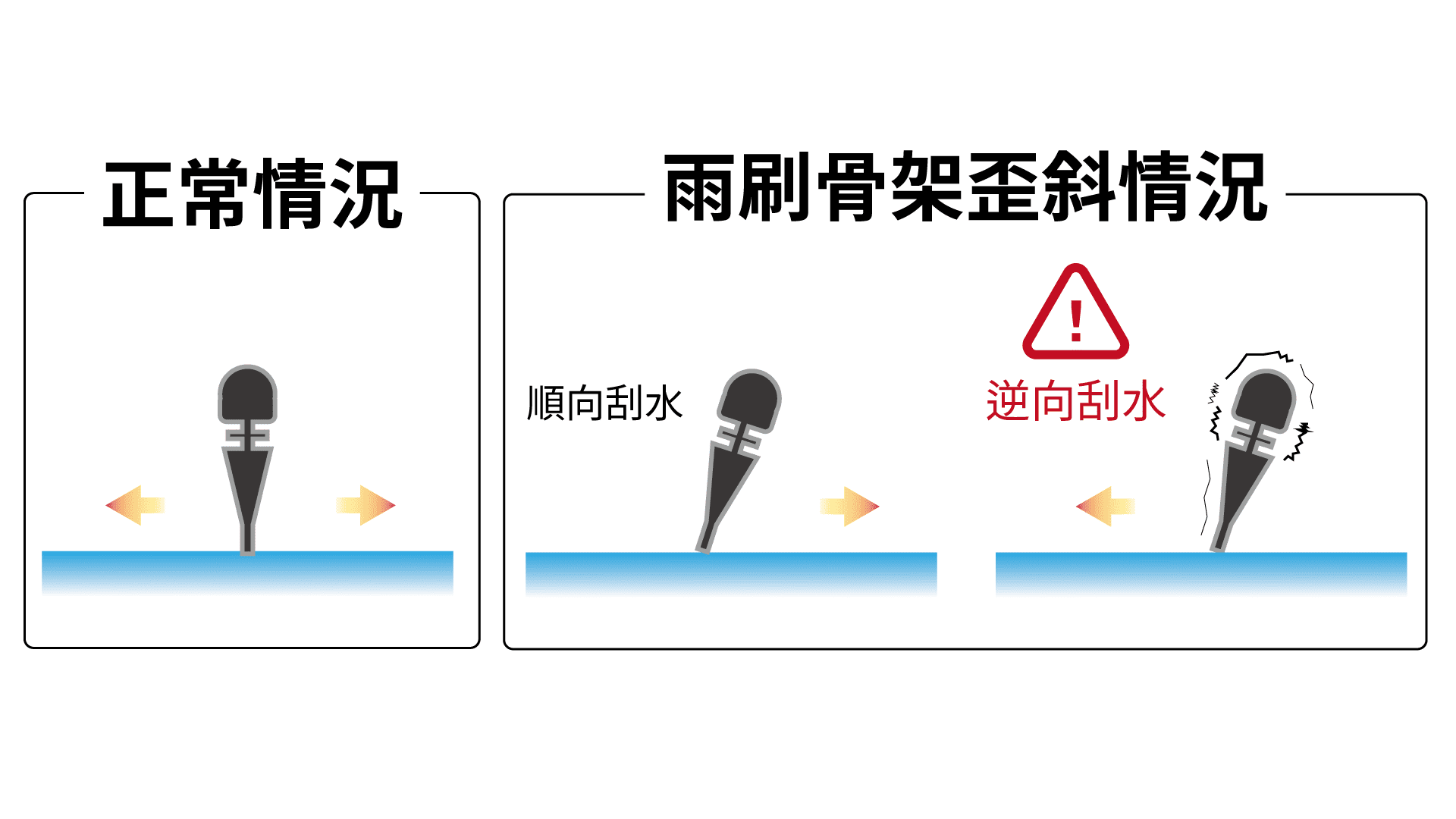 雨刷骨架歪斜,導致雨刷膠條不是垂直於玻璃表面。