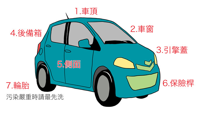 洗車的基本大原則就是從上往下、由最乾淨的往最乾淨地方清潔,沖水的時候也是同樣的原則。