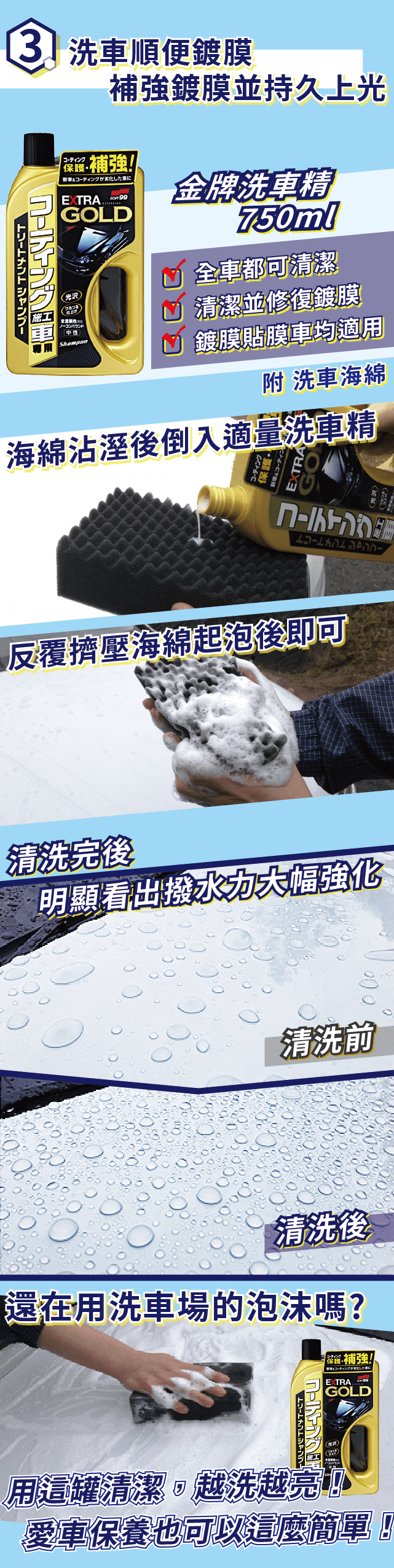 1.金牌洗車精:清潔車身髒污並修復撥水鍍膜層。