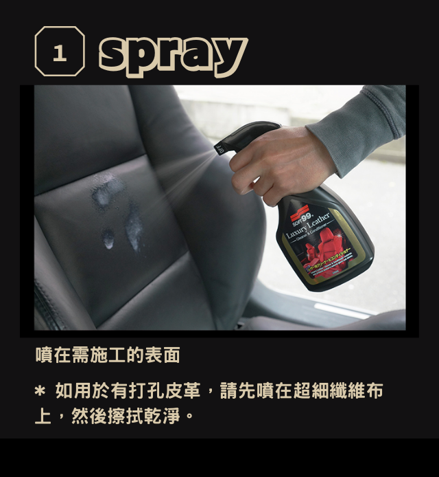 對於孔狀皮革,請先噴在超細纖維布上,再擦拭需施工的表面。