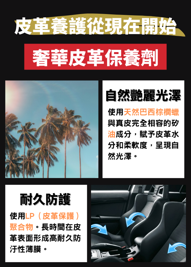 天然清潔劑可徹底清潔乾淨,不會油膩及過於乾燥的疑慮,含豐富的天然棕櫚蠟成分,使皮革呈現深且奢華的光澤。