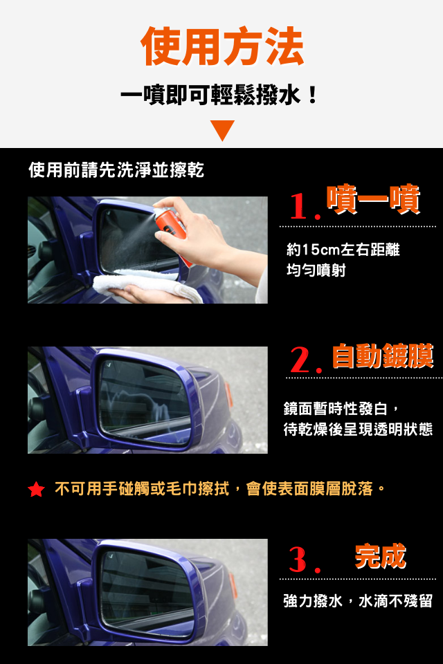 A1: 使用清潔劑洗去鏡子上的泥土。 如果用了防水劑或油膜,請用油膜清潔劑將其除去。