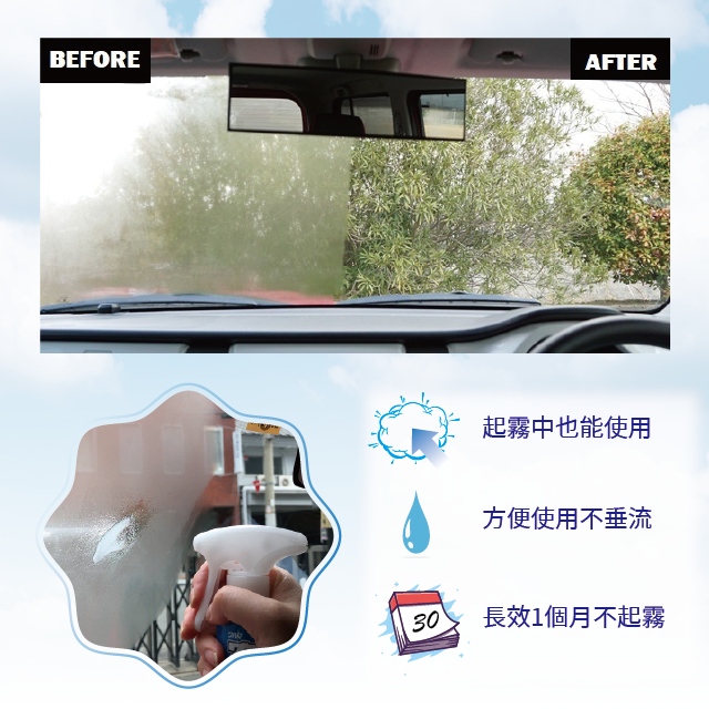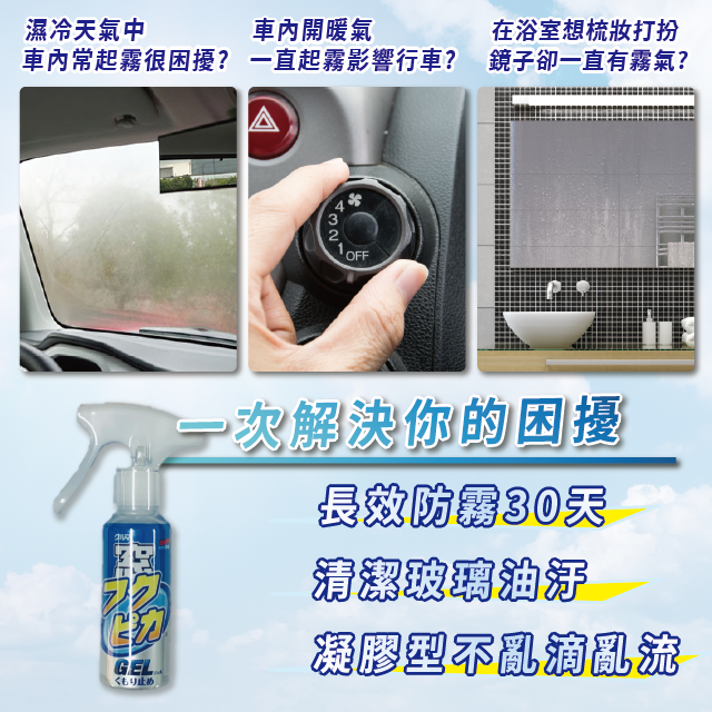為凝膠型防霧劑,噴在擋風玻璃的內側或側邊垂直的玻璃,不易垂流,耐久性佳,長時間保持玻璃防霧效果。不需先做清潔的動作,能去除玻璃內側的手指印及煙漬,同時形成防霧的保護膜,適用於防紫外線和紅外線的玻璃。