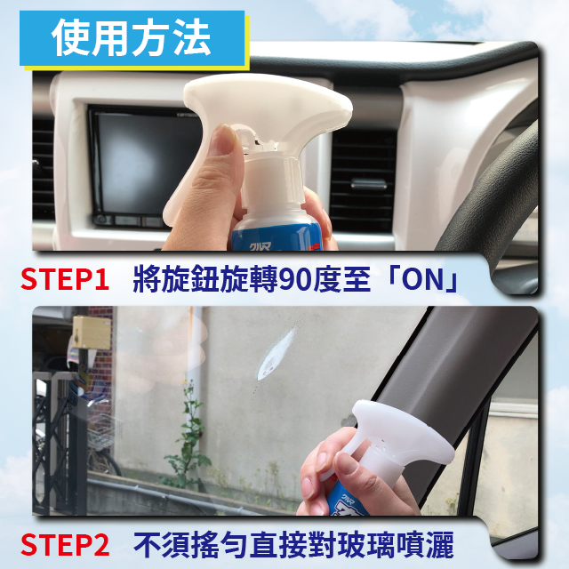 2.請勿搖動本劑,距離玻璃10至15公分處噴灑。
