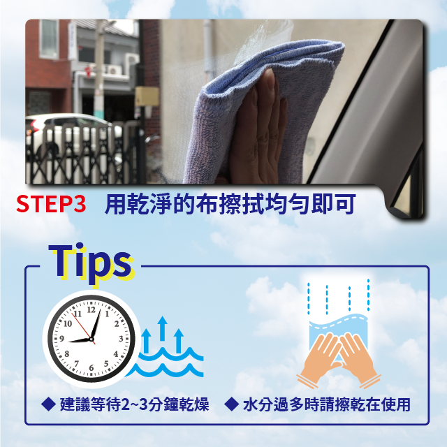*若施工後,產生微泛白的情況時,請另購C235驚奇布(玻璃用)清潔後,再度施工。