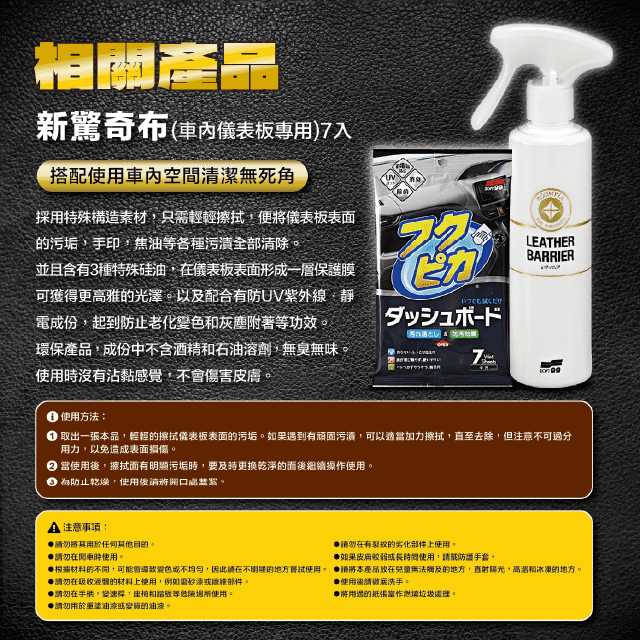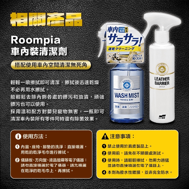 A5: 不可以用在人造麂皮材質上。人造麂皮材質的話,請使用纖維布坐席用強力防護隔離覆膜劑