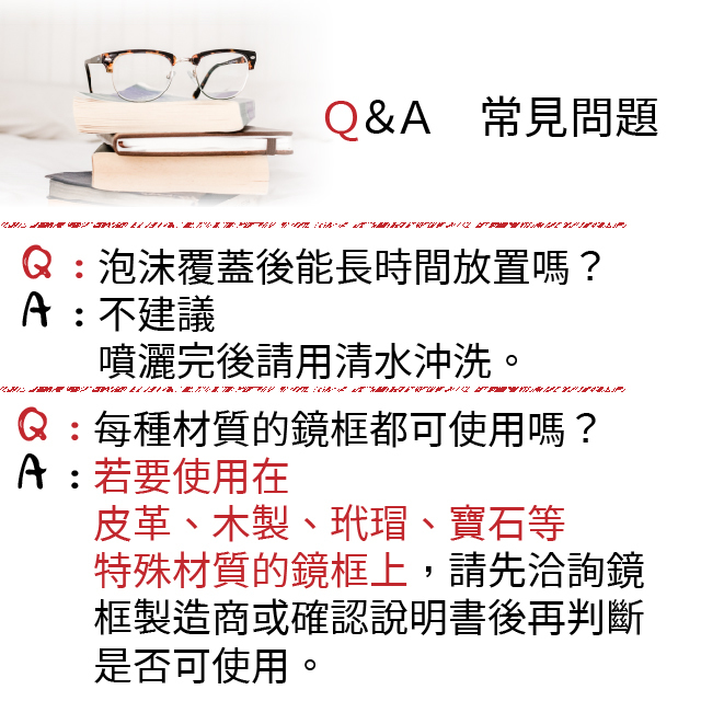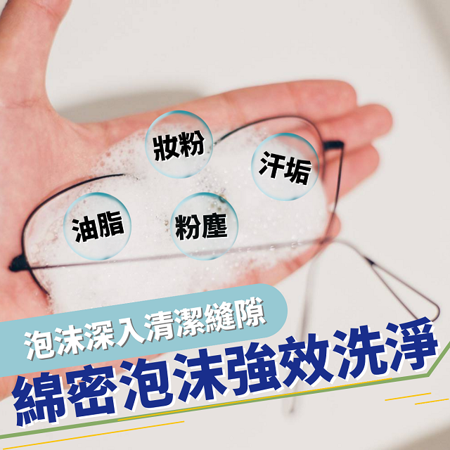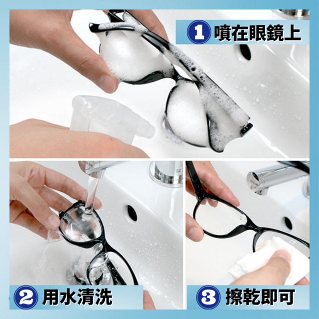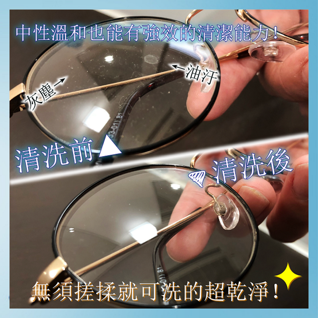 只需噴在眼鏡上,無需搓洗,用水沖即可去污除菌。汗液和皮脂污垢,鼻托與耳朵接觸面,連肉眼無法看到的雜菌,也可輕鬆去除。中性配方,不傷鏡片和鏡框。