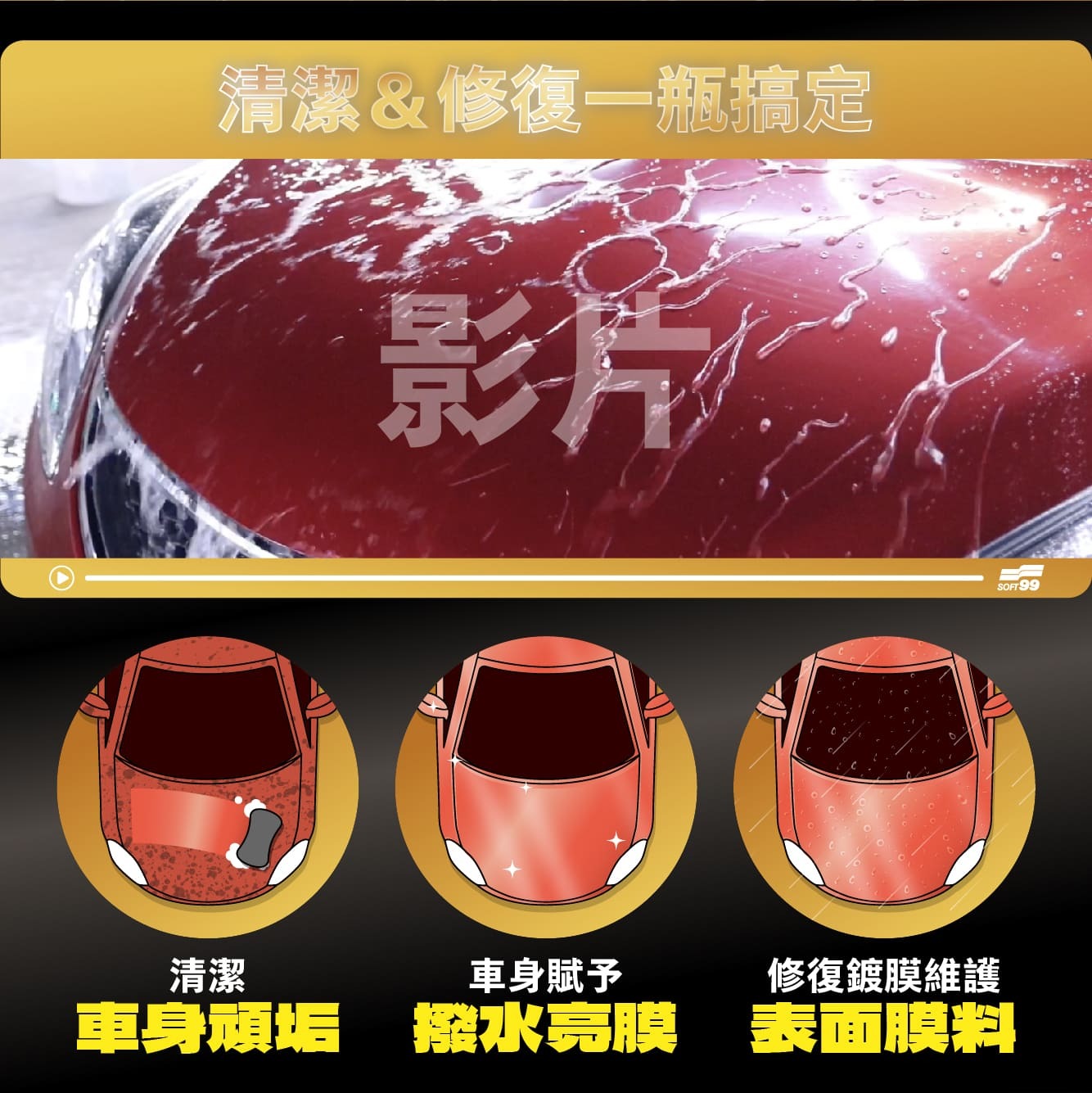 修復變弱的專業鍍膜,重現艷麗光澤,增強其撥水效果。 為專業鍍膜的洗車精,修復損傷或脫落的玻璃系鍍膜,在其表面形成均一的撥水性。