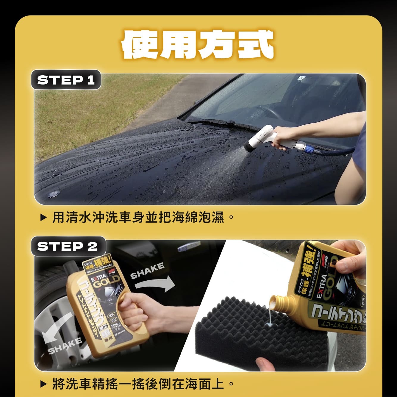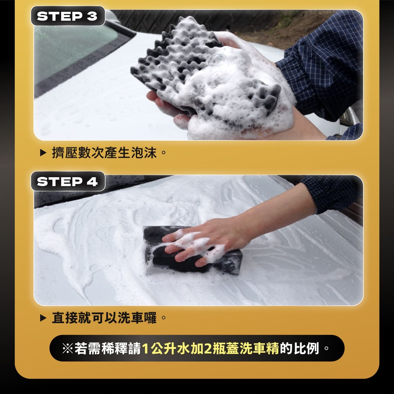 搖勻本罐後,倒適量於浸濕附帶的海綿上,揉搓出豐富泡沫,然後開始清洗。或選擇先調配洗車精,按照1公升水加2瓶蓋洗車精的比例調製。