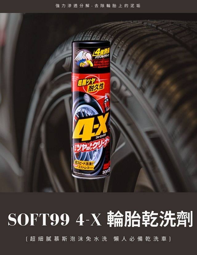 4-X是新式快速清潔輪胎噴臘,直接噴灑在輪胎上,立刻產生發泡作用,自動地洗淨嚴重污垢,馬上呈現美麗光彩,形成一層保護膜,阻隔陽光中紫外線,預防污垢附著輪胎上,避免輪胎退色、劣化。