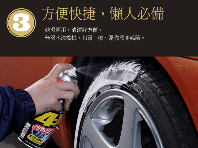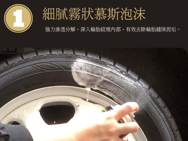 2.不要先用水洗,請直接噴灑在輪胎上,泡沫即自然洗掉污垢。